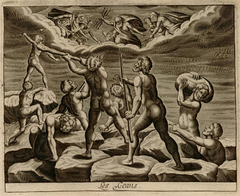 Vzpoura a pád Gigantů (Gigantes): vzbouření Giganti padající na zem pod tíhou balvanů.
