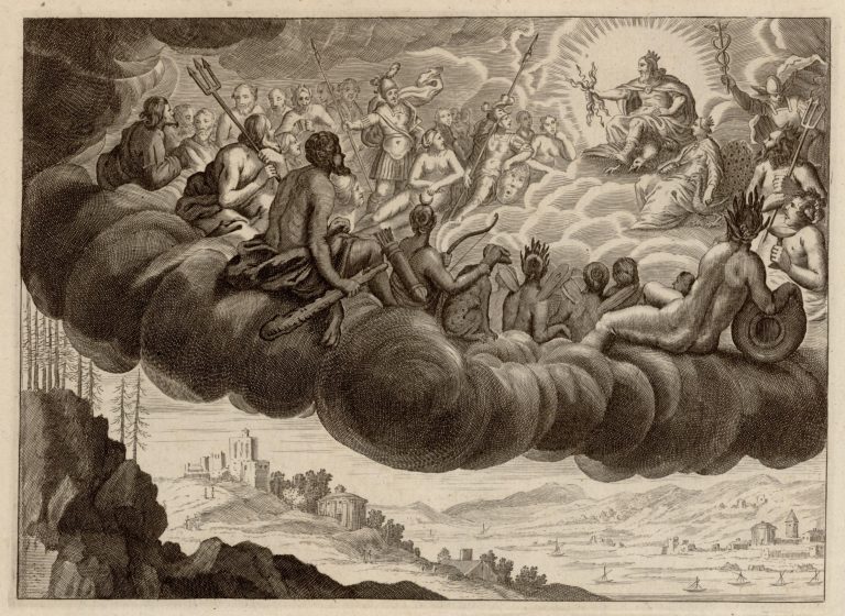 Shromáždění nebeských bohů a bohyň okolo Dia (Iuppiter) a Héry (Juno; Iuno), v dolní části rytiny znázorněná země s krajinou, městem, zálivem a loděmi.
