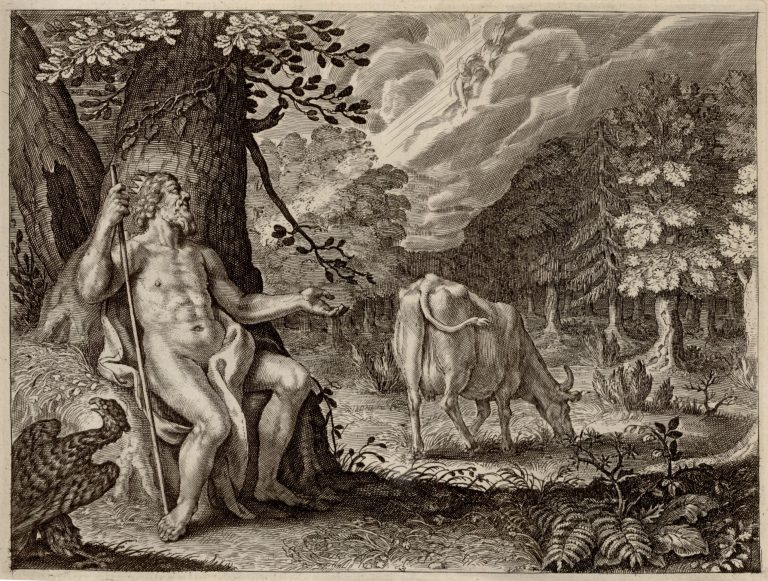 Zeus (Iuppiter) s holí v ruce sedí opřený o vzrostlý buk, vedle něj orel, a ukazuje na proměněnou Íó – pasoucí se krávu na mýtince mezi stromy. Z oblak shlíží Héra (Juno; Iuno), v pozadí smíšený les.