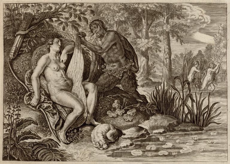 Na břehu řeky spící nymfa Sýrinx drží rukou luk, opodál toulec s šípy, u jejích nohou schoulený psík. Bůh Pán (Faun) odkrývá nymfě roucho. V pozadí výjev z proměny Sýringy: Pán pronásleduje nymfu, která se promění v rákosí. Výjev je zasazen do krajiny.