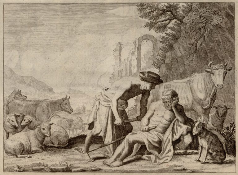 Hermés (Merkur; Mercurius) se naklání nad spícího pastýře Arga, který měl za úkol hlídat Íó, a chystá se ho zabít – vytahuje meč z pochvy. Íó v podobě krávy za nimi, okolo ovce a krávy, u Arga psík, v pozadí krajina s rozbořenou stavbou.
