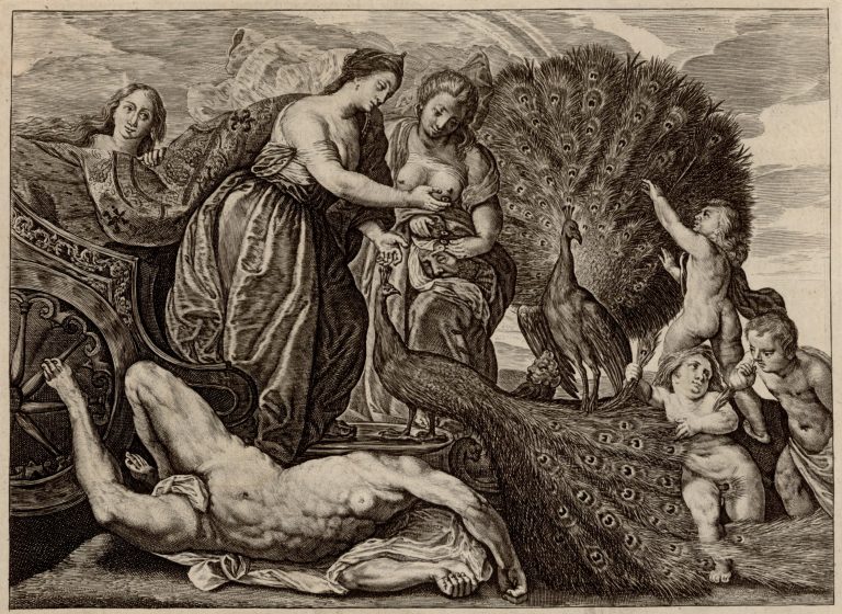 Héra (Juno; Iuno) zdobí očima stookého Arga peří svých pávů. Asistuje jí žena, druhá přidržuje Héře bohatý šat, u pávů jsou tři putti, vlevo Héřin vůz (zlacení a kolo), na zemi leží bezhlavý Argos, zabitý Hermem (Merkur, Mercurius).