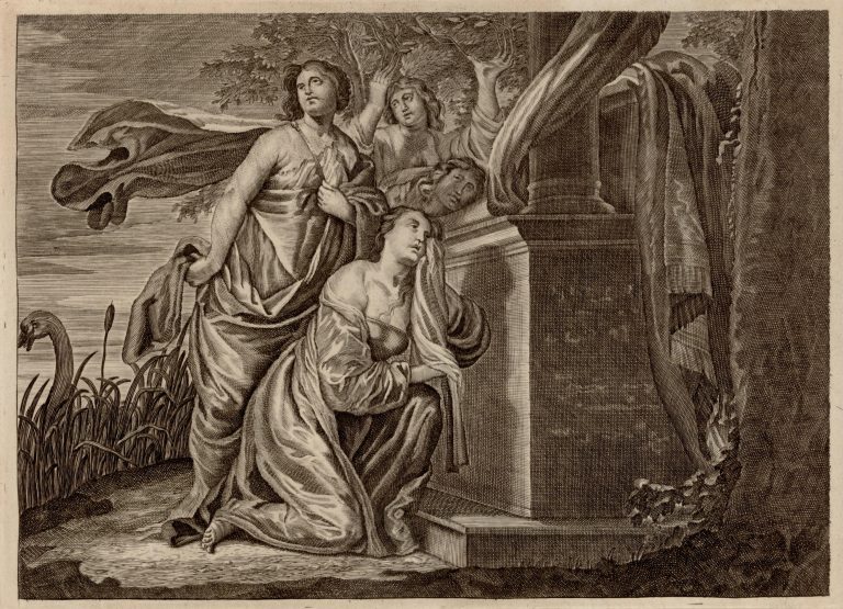 Truchlící klečící Klyméné a Héliovy dcery (Faëthúsa, Lampetié a Aiglé) u hrobu Faëthonta s ozdobnou látkou. Jedna z Hélioven se proměňuje v topol. V levém rohu rytiny rákosí a labuť – proměněný Kyknos. Výjev je zasazen do krajiny.