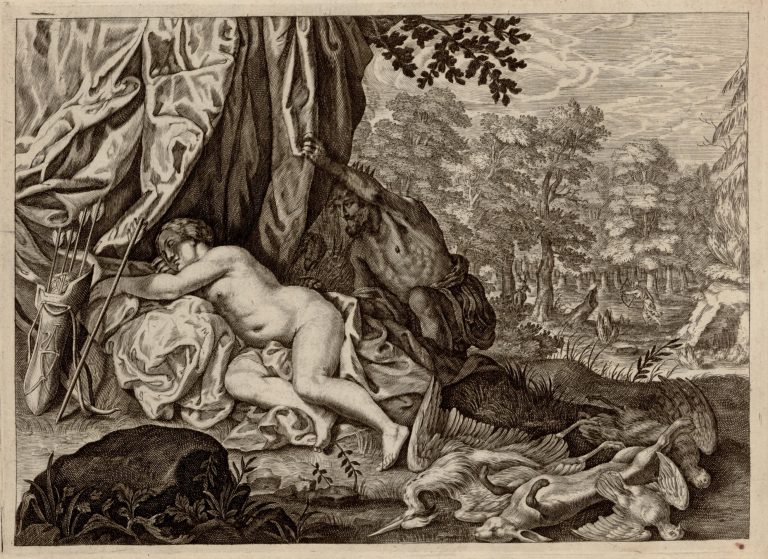 Odpočívající Kallistó na bohatě nařasené látce, vedle toulec s šípy a ulovená zvířata (zajíc, ptáci). Zeus (Iuppiter) poodhrnuje látku a prohlíží si Kallistu. V pozadí lesnatá krajina a Kallistó při lovu jelena.