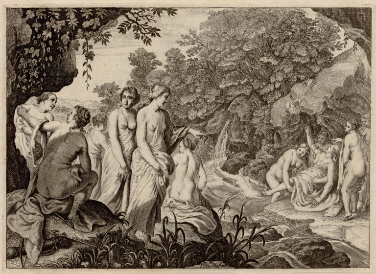 Krajina s vodopádem – říčkou, na břehu v popředí Artemis (Diana) obklopená družkami ukazuje a vypuzuje těhotnou Kallistó ze své družiny. Kallistó se zahaleným tělem s nymfami na protějším břehu, dvě nymfy ji drží, Kallistó ukazuje rukou vzhůru, jedna nymfa ve vodě.