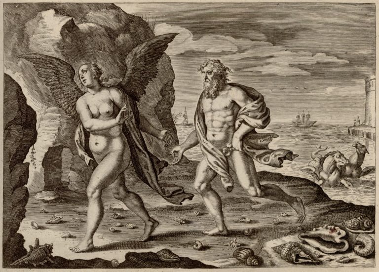 Na písčitém břehu moře, který je hojně pokrytý lasturami, prchá před Poseidónem (Neptun) Koróné měnící se ve vránu (zásah bohyně Athény/Minervy). V pozadí je moře, Poseidónovo spřežení, lodě a maják.