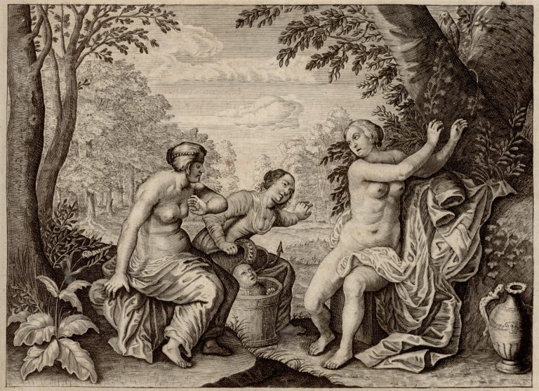 Překvapené Pandrosos, Aglauros a Hersé sedí u otevřeného proutěného koše, který měly hlídat se zákazem zjistit, co je v něm. V koši je malý Erichthonius a hadi, Aglaura drží víko koše. Na větvi vzrostlého stromu pozoruje scénu vrána, v pravém rohu váza, výjev je zasazen do krajiny.