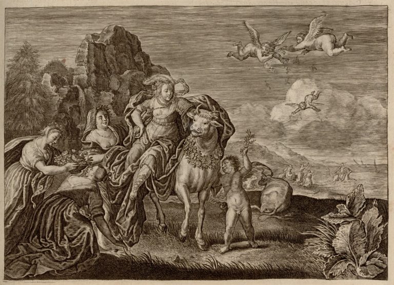 Krajina se skálou a vodopádem na břehu moře. Európé sedí na hřbetě býka – proměněný Zeus (Iuppiter), okolo Europiny družky s květinami, u býka stojí Éros (Amor; Cupido). Na nebi tři amorkové rozhazující květy, na pobřeží ležící krávy a zoufalé ženy, v pozadí v moři býk s Europou a lodě.