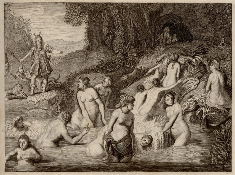 Nahá Artemis (Diana) s nymfami při koupeli. Výjev ze břehu pozoruje Aktaión s kopím a loveckými psi okolo, na hlavě mu raší parohy – počíná proměna v jelena. Šaty, látky, lovecké zbraně a kořist položená na břehu, v jeskyni naznačená postava se zvířetem.