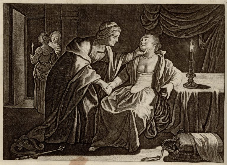 Interiér pokoje osvětlený svící na stole. Semelé sedící u stolu, u ní stojí Héra (Juno; Iuno) v podobě staré chůvy Beroé a přesvědčuje ji, aby vyzkoušela svého milence Dia (Iuppiter). Na zemi košík s vyšíváním, lyra a hůlka, v pozadí u otevřených dveří dvě ženy se svící.
