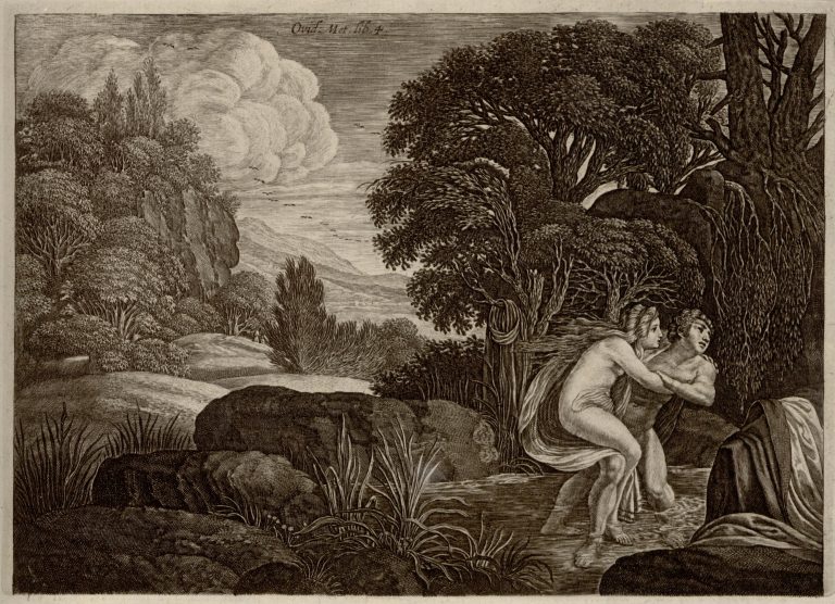 V jezírku nymfa Salmakis objímá Hermafrodíta, který se objetí vzpírá. Na kamenu na břehu jezírka jsou látky. Výjev je zasazený do prokreslené krajiny se skálou, vzrostlými stromy, keři, loukou a rozličnými rostlinami, na obloze naznačeni letící ptáci.