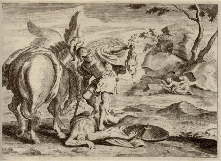 Perseus stojí na Medúsině mrtvém těle, z něhož prýští krev, v jedné ruce drží její uťatou hlavu a v druhé ruce meč, na zemi leží štít. Nalevo okřídlený kůň Pégasos, který povstal z krve (nebo těla) Medúsy. V pozadí dvě ležící postavy – Gorgony (Euryalé a Sthenó) u skal.