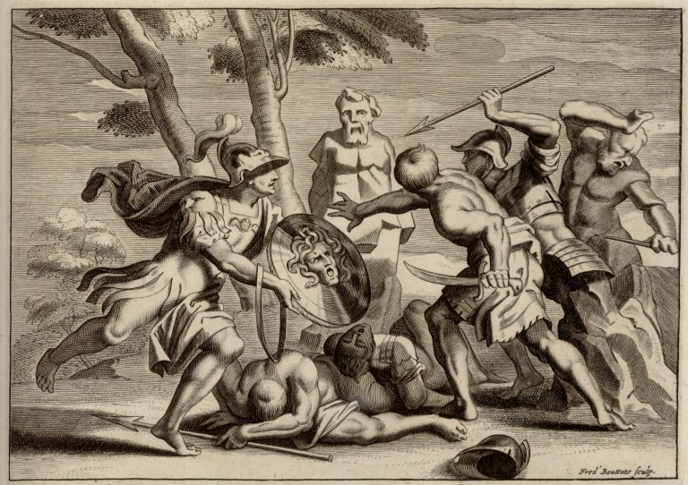 Perseus ukazuje Fíneovi a jeho mužům štít s hlavou Medúsy, zápasící muži se mění v kamenné sochy, na zemi dva mrtví muži. Výjev se odehrává venku pod listnatými stromy.