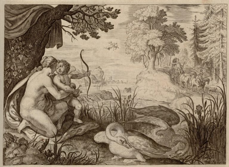 Na břehu řeky či jezera pod stromem Afrodíté (Venuše) nabádá malého Amorka (Erós; Cupido), aby vystřelil šíp lásky na Háda (Plútón; Dis), v popředí pár labutí. V pravé části na lesní cestě Hádés (Plútón; Dis) v kočáře taženém čtyřmi koni, před nimiž běží pes, na jednom z koní naznačený jezdec. Na obloze Amorek mířící na Háda. Krajina se splavem, lesem, v pozadí naznačené město.