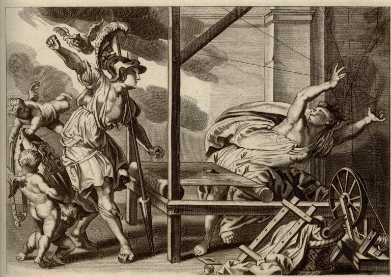 Athéna (Minerva) před tkalcovským stavem trestá Arachné proměnou v pavoučici. Arachné vztahuje ruce k pavučině, okřídlení putti drží štít s hlavou Medúsy, nad Athénou sova, okolo tkalcovské pomůcky.