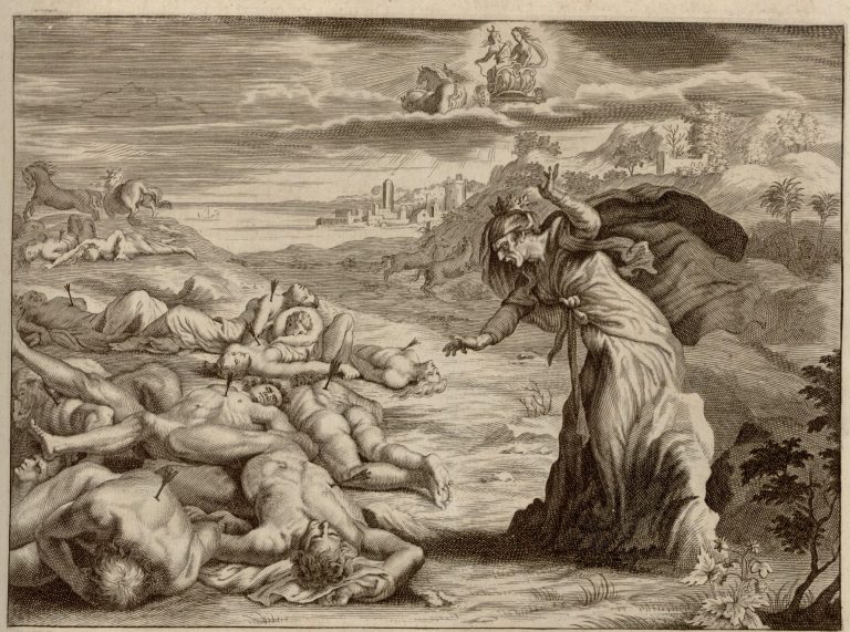 Zoufalá Niobé nad těly zabitých dětí se mění v kámen. Opodál prchající koně, v pozadí na nebi vůz s odjíždějícími vykonavateli pomsty Artemidou (Dianou) a Apollónem. Výjev je zasazen do krajiny, v pozadí město a moře s lodí.
