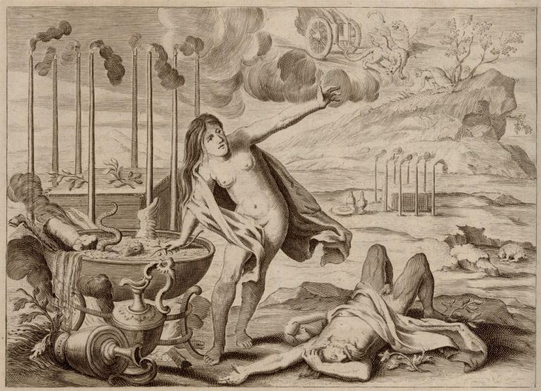 Médeia u kotle s čarodějnickými přísadami připravuje kouzelný lektvar, na zemi leží starý Aisón, jež bude omlazen, opodál oltář se svícemi. Médea na pahorku trhá byliny pro lektvar, dračí spřežení čeká v povětří. Napravo obětovaný beránek, za ním menší oltář se svícemi a nádobami.