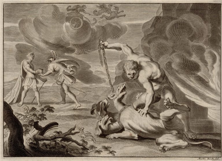 V popředí Héraklés (Hercules) přemáhá trojhlavého psa Kerbera, vyvlekl ho z podsvětí na zem. Ne zemi oměj, vyrostlý z Kerberových jedovatých slin. Aigeus a Théseus drží nádobu s jedem (lektvar z oměje), Aigeus zabrání Théseovi, aby se napil. Médeia na dračím spřežení uniká obklopená mraky.