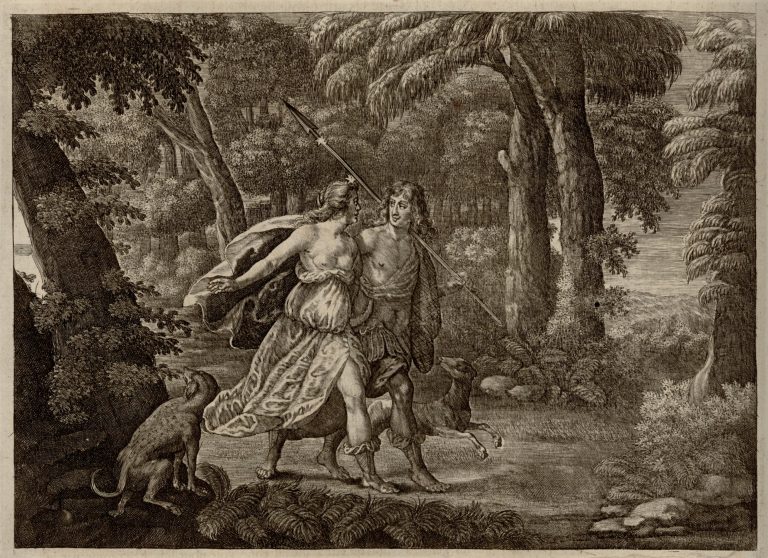 Eós (Aurora; Jitřenka) a Kefalos (Cephalus) s kopím v lese. Okolo nich jsou dva lovečtí psi.