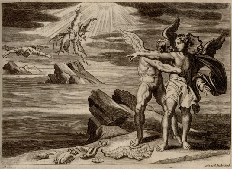 Na skále u moře připevňuje Daidalos (Daedalus) Íkarovi křídlo, druhé leží na zemi s krabem a lasturami, v pozadí znázorněný Íkarův pád.