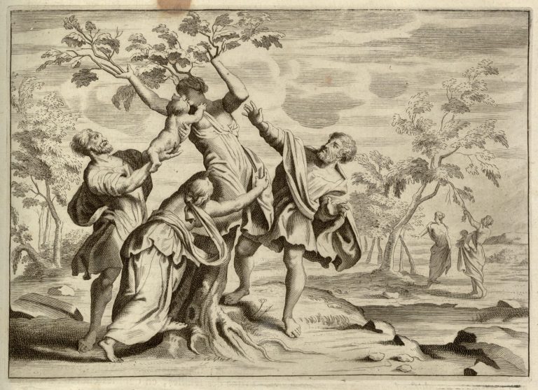 V popředí se Dryopé stává lotosovým stromem (jojobou), líbá synka Amfissa, kterého ji podává manžel Andraimón. Eurytos, otec Dryopé, v zoufalém gestu a Iolé, která Dryopé objímá. Za výjevem to, co proměně předcházelo: Dryopé se synkem v náručí trhá květ lotosového stromu, ve který byla proměněna Lótis, vedle stojí Iolé.