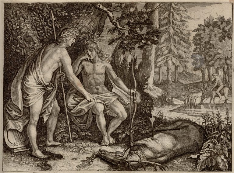 Stojící Apollón ukazuje na mrtvého jelena, vedle sedí truchlící Kyparissos, který zastřelil milovaného jelena zasvěceného nymfám. Z Kyparissovy hlavy začínají rašit větvičky. Zabitý jelen v popředí s šípem v hrudi a zdobeným obojkem na krku (náhrdelník), naznačeno krvácení. V pozadí výjev z minulosti – Kyparissos sedící na hřbetě posvátného jelena, jelen se napájí vodou z říčky v lese.