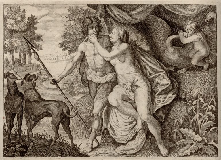 V centru objímající se zamilovaná Afrodíté (Venuše) a Adónis, Adónis drží kopí. Nalevo dva lovečtí psi, napravo v rohu pod baldachýnem malý Amorek (Erós; Cupido) s párem labutí. Výjev zasazen do krajiny.