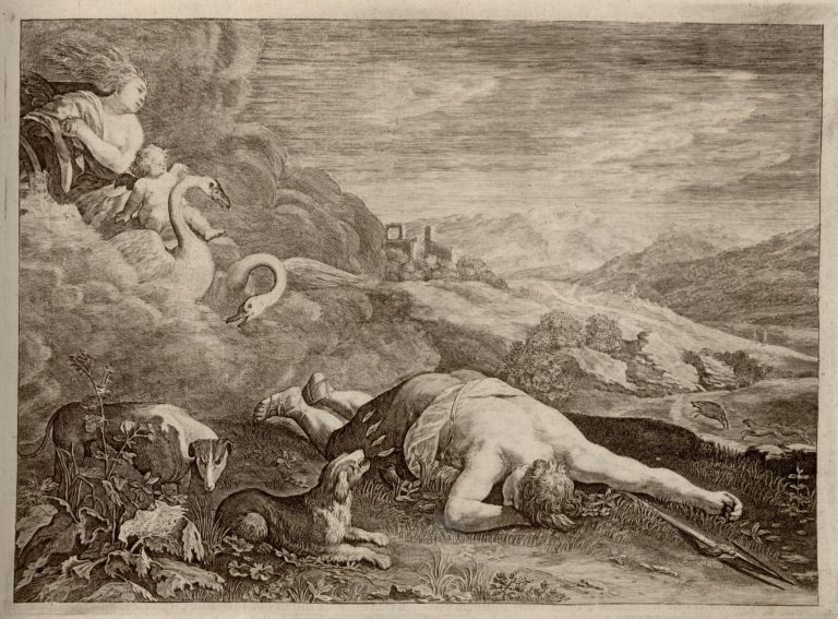 Mrtvý Adónis s potrhaným šatem leží tváří k zemi, pod ním kopí a vedle dva lovečtí psi. Nalevo v oblacích v labutím spřežení spěchá Afrodíté (Venuše) a malý Amorek (Éros; Cupido). U Adónidovy hlavy květina – větruška (sasanka či pomněnka), ve kterou ho Afrodíté (Venuše) promění. V pozadí kanec, který rozsápal Adónida, štvaný psi. V pozadí naznačeny dvě postavy a stavby.