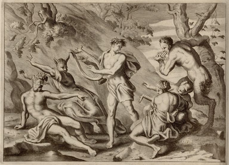 Uprostřed stojí Apollón s lyrou, po pravé straně Pán (Faun), který se drží kmene stromu a hraje na syringu. Pod ním sedí dvě víly, jedna s loutnou. Napravo bůh Tmólos jako soudce, král Midás s počínající proměnou oslích uší.