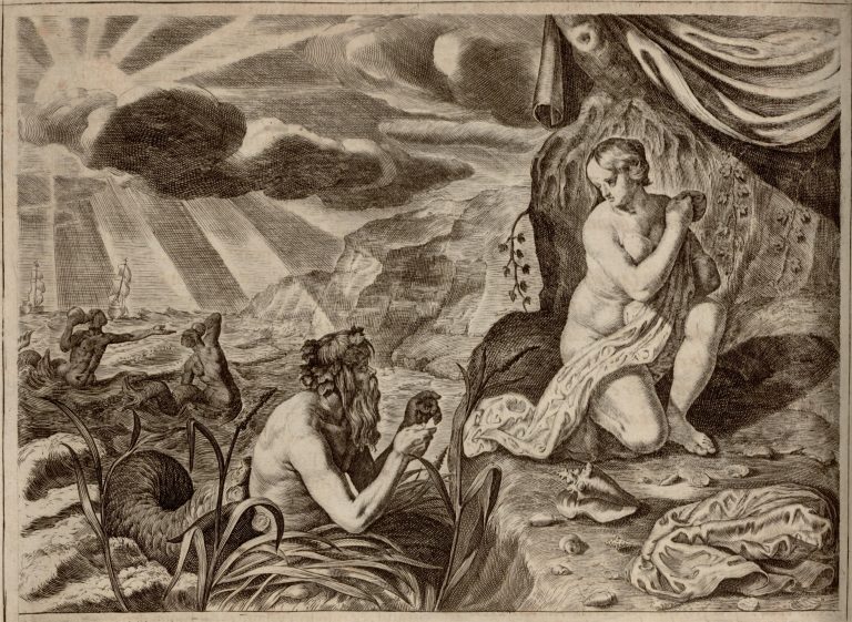 Glaukos v moři mluví ke Skylle (Scylla), která klečí na břehu pod baldachýnem. Na zemi jsou lastury, v popředí rákos – tráva, která způsobila Glaukovu proměnu. V moři Tritóni troubí na lastury, po pravé strany útesy a úplně vzadu lodě.