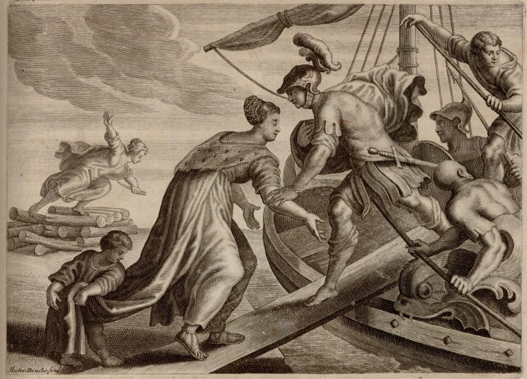 Na břehu u lodě se královna Dídó setkává s Aineiásem (Aeneas). Oba stojí na prkně vedoucí na loď, Dídó s přijímajícím gestem, látku pláště ji drží malý chlapec. Aineiás (Aeneas) se dotýká královniny paže, oba dva jsou skloněni v pozdravu. Na lodi posádka, loď je ozdobená stylizovanou sochou delfína. Po pravé straně sebevražda Dídó – zklamaná královna se na hranici chystá probodnout dýkou.