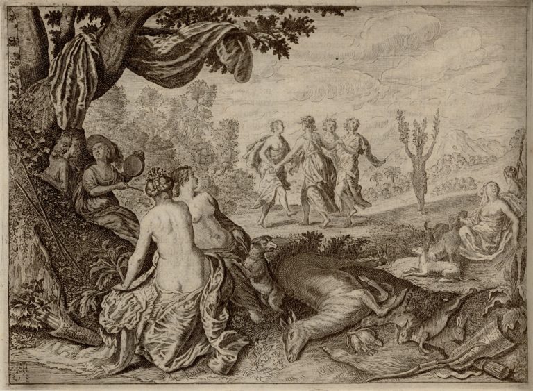 V popředí jsou odpočívající nymfy zastíněny látkou přehozenou přes větev, na zemi mrtvá ulovená zvířata (laň, liška, zajíc, pták), luk s toulcem a šípy. Nalevo hudebnice hraje na bubínek a satyrové. Uprostřed v kruhu tančí víly a apulský pastýř je potrestán za urážky a pronásledování nymf proměnou v divoký olivový strom. Vpravo také odpočívají nymfy se psy. Výjev zasazen do krajiny.