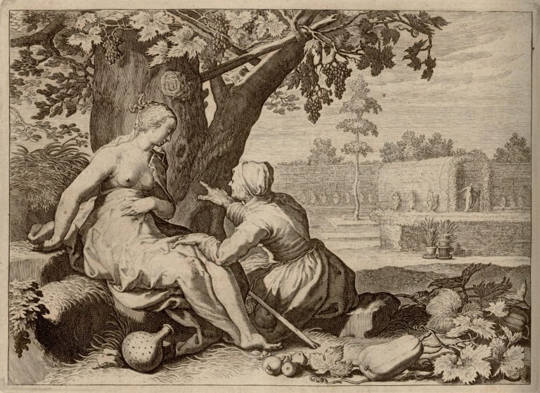 U stromu v zahradě sedí Pomona, před ní klečí a vypráví stará žena – proměněný Vertumnus. Na zemi nádoba, dýně a hrušky, na jilmovém kmeni se popíná vinná réva. V pozadí zahrada se sochou a květináči s rostlinami.