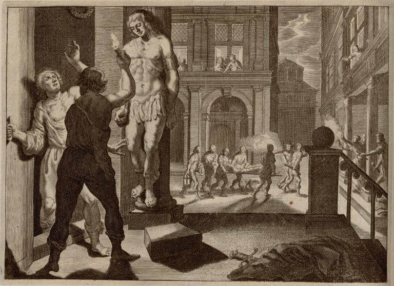 U dveří oběšený mladík Ífis, před ním dva vyděšení sluhové, jeden s hořící svíčkou, na zemi plášť, meč a stupeň. V pozadí pohřební průvod ulicí města, muži nesou na márách mrtvého Ífida. Z oken vše sleduje Anaxareté a další pozorovatelé. Anaxareté láskou Ífida pohrdala, za tvrdé srdce proto bude proměněna v kámen.