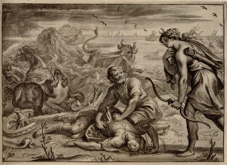 Klečící muž na mořském břehu se sklání nad mrtvým Hippolytem, bohyně Artemis (Diana) s lukem a šípy je v soucitném gestu. Vedle zlámané kolo od vozu a zbytky spřežení po nehodě, ve vlnách splašení koně a zuřivý býk, který na rozkaz boha Poseidóna (Neptuna) splašil Hippolytovo spřežení. V pozadí lodě na moři, na nebi letící ptáci. Hipollytus byl po smrti Artemidou (Dianou) proměněn na Virbia, aby mohl v klidu žít.