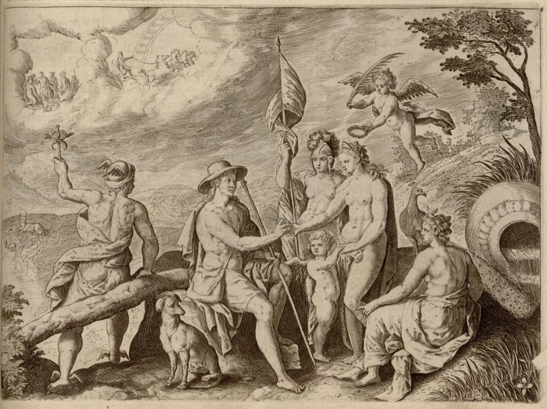 Ve středu Paris v pastýřském podává jablko stojící Afrodítě (Venuši), kterou vybral jako nejkrásnější bohyni ze tří. Afrodítu drží za ruku Amorek (Erós; Cupido), Athéna (Minerva) ve zbroji a s vítězným kopím ji drží za ramena, nad Afrodítou okřídlený puttó s věncem a palmovou ratolestí. Alegorie triumfující lásky, která je obklopena moudrostí a ověnčená slávou. Sedící Héra (Juno; Iuno) s pávem ukazuje na psa, který sedí u Paridových nohou – symbol věrné lásky a oddanosti. Napravo z vázy vyvěrá voda. Nalevo zády otočený Hermés (Merkur; Mercurius) sedí na kmeni a ukazuje caduceem k nebi, kde je v oblacích shromážděn a na pozemské dění shlíží načrtnutý olympský pantheon – v popředí Zeus (Iuppiter) s orlem, sluneční vůz řízený Apollónem = Héliem (Sol; Slunce). V pozadí krajina, ovce a kráva (býk?).