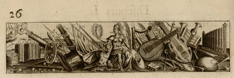 V centru sedící Athéna (Minerva) se sovou drží v pravé ruce vavřínový věnec a v levé palmovou ratolest. Na pravé straně od ní je panoplia, střílející dělo a hořící stavby, nalevo hudební nástroje a knihy.