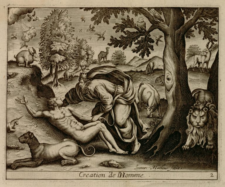 Pod vzrostlým dubem, na kterém sedí sova a havran (?), se Prométheus sklání nad prvním stvořeným člověkem. Okolo jsou v krajině se stromy zvířata – lev, pes, jednorožec, kráva, ovce, zajíc, jelen, velbloud, medvěd, na obloze ptáci.