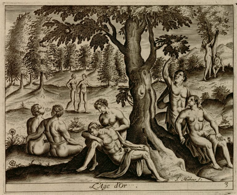 Vyobrazení zlatého věku: spokojení lidé po dvojicích v krajině se stromy, někteří se natahují pro ovoce na stromech.