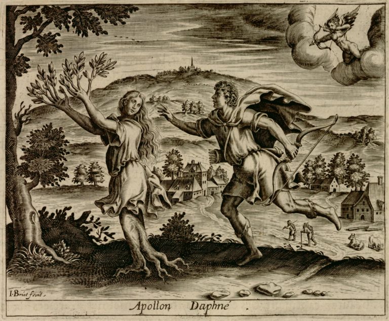 Dafné se proměňuje ve vavřínový strom, běžící Apollón s lukem k ní vztahuje ruku a z mraků na ně šípem míří Erós (Amor; Cupido). Výjev je zasazen do osídlené krajiny, v pozadí domy, lidé, skot.