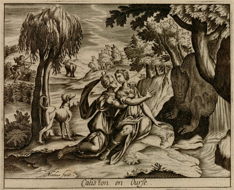 V popředí Zeus (Iuppiter) proměněný v Artemis (Dianu) objímá Kallistó. Po levé straně lovecký pes, po pravé straně se u pramene Kallistó mění v medvědici. V pozadí na medvědici míří šípem Arkás.