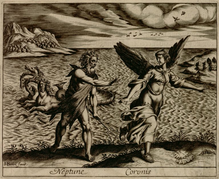 Na mořském břehu Poseidón (Neptun) pronásleduje Koróné s křídly – proměna ve vránu. Na moři čeká Neptunovo spřežení, v pozadí krajina, na obloze letí ptáci.