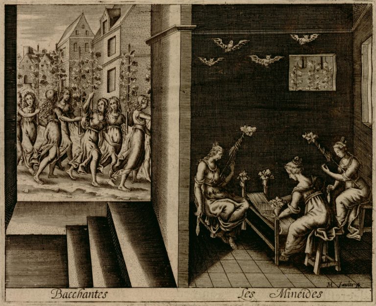 Průřez domem – v místnosti sedí tři dcery krále Minya a věnují se předení a tkaní, z přeslic a tkalcovského stavu raší břečťanové větvičky. U stropu poletují čtyři netopýři, v které se Minyovny za trest proměnily. Na ulici za domem jde průvod bakchantek s rozpuštěnými vlasy a thyrsy.