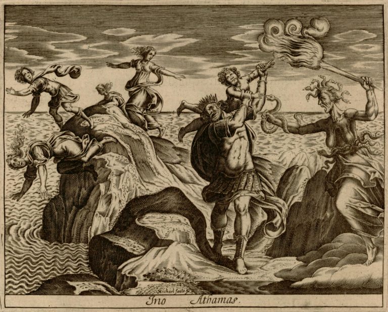 Na břehu král Athamás v šílenství zvedá nad hlavu malého synka Learcha, vedle stojí Tísifoné s hořící pochodní a s hady, z nichž jeden téměř uštkne Athamásovu paži. Za nimi se vrhají ze skály do moře Ínó a Melikertes. Íniny družky se na skále mění v kameny. Íno bude proměněna v mořskou bohyni Leukotheu a Melikertés v Palaimóna.