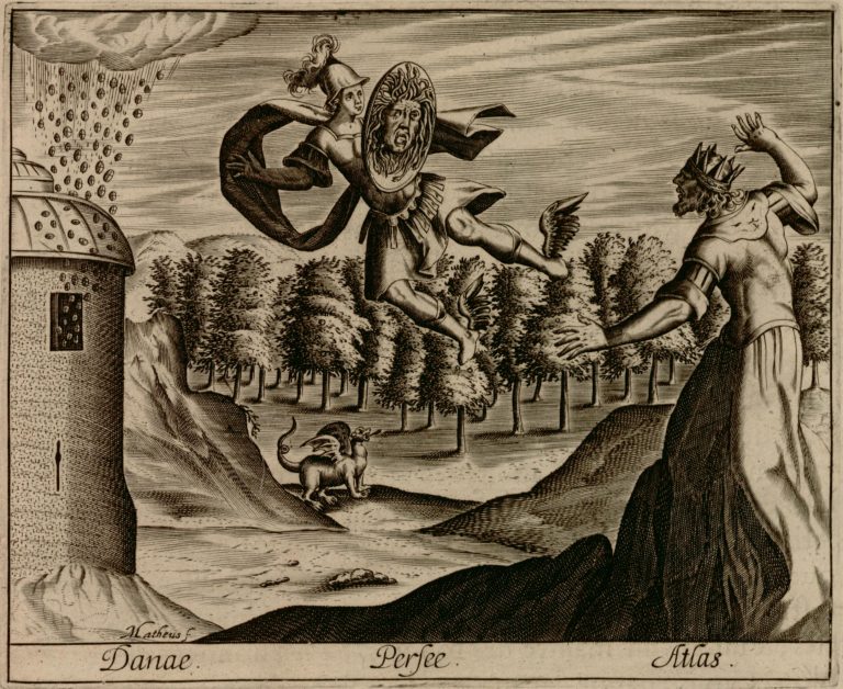 V levé části věž, ve které je vězněna Danaé, a zlatý déšť – proměněný Zeus (Iuppiter), který padá do okna. Uprostřed krajina s drakem (z krůpěje krve z Medúsiny hlavy, co spadla na zem) a vznášející se Perseus se štítem s Medúsinou hlavou, napravo Atlás, který se stává pohořím.