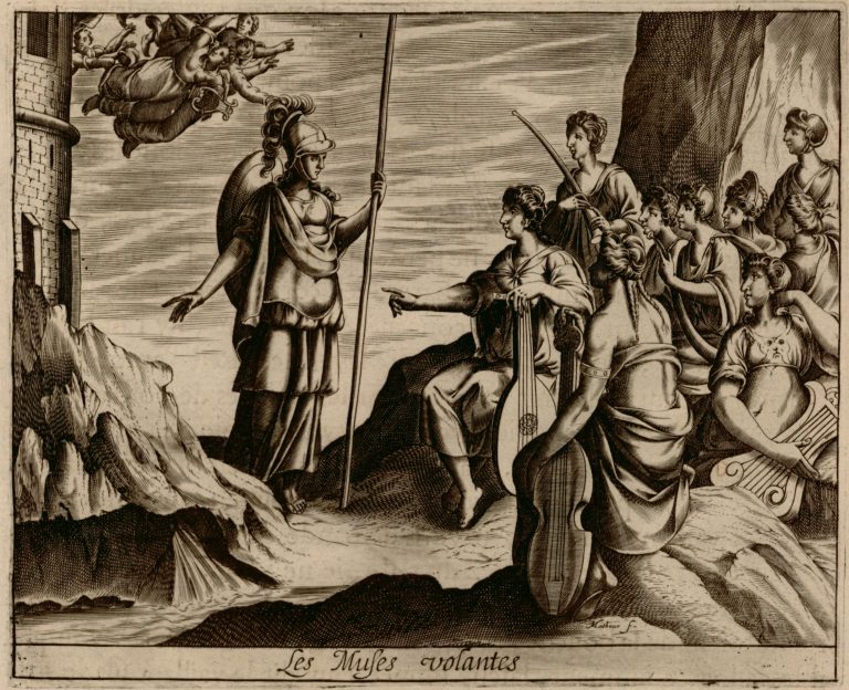 V dolní části rytý francouzský nápis Les Muses volantes.