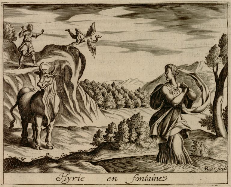 V popředí se Hyrié rozpouští slzami v jezero. Po levé straně býk, kterého se Fyllios (Phylius) rozhodl dát jako dar Diovi (Iuppiter) namísto Kyknovi, protože byl zklamán v lásce. Za býkem skála, z které se z pomsty vrhá Kyknos – v letu se mění v labuť – za ním Fyllios.