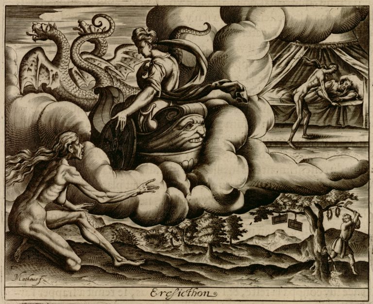 V pravém dolním rohu Erysichthón kácí posvátný dub, z rány kmene prýští krev. Uprostřed na oblaku Démétér (Ceres) ve voze taženém draky posílá Hlad, aby potrestal Erysichthóna. V pravém horním rohu se v ložnici sklání Hlad nad spícím Erysichthónem.