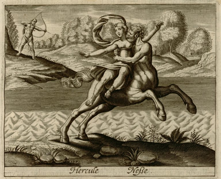 Kentaur Nessos unáší Déianeiru (Déïaneira; Deianira). Za řekou na břehu Héraklés (Herkules) s lukem a šípem mířící na únosce.