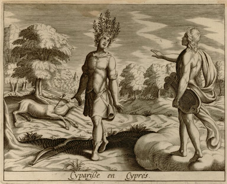 Kyparissovi z hlavy raší větvičky cypřiše, ve který se proměňuje. Napravo skolený posvátný jelen, nalevo na oblaku Apollón s lyrou.